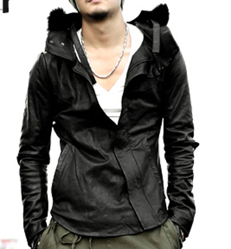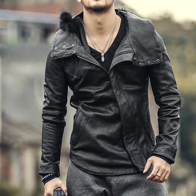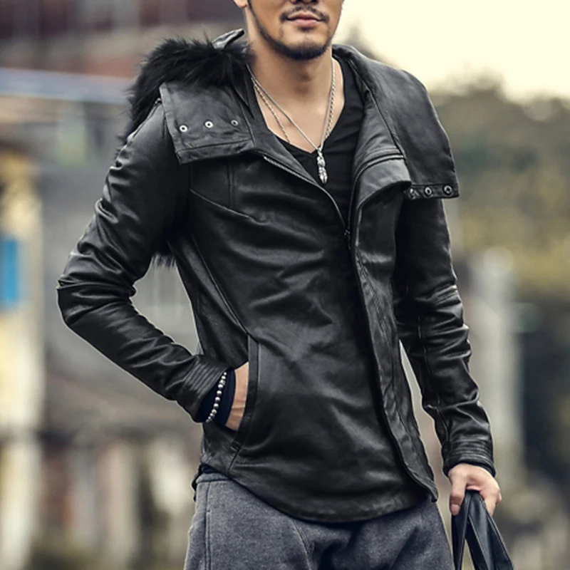 Cheap Men new Fashion Winter Warm Leather Jacket Men Hat Detachable genuine Leather Jacket Designer Motor