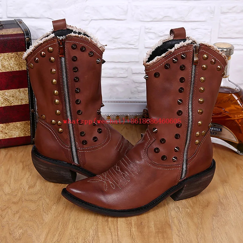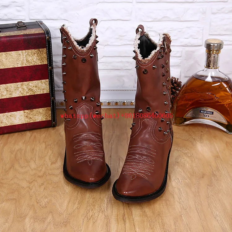 Promo Italian Men Knee High Boots Black Brown High Top Work Studded Cowboy Boots Pointed Toe Rivets Motor