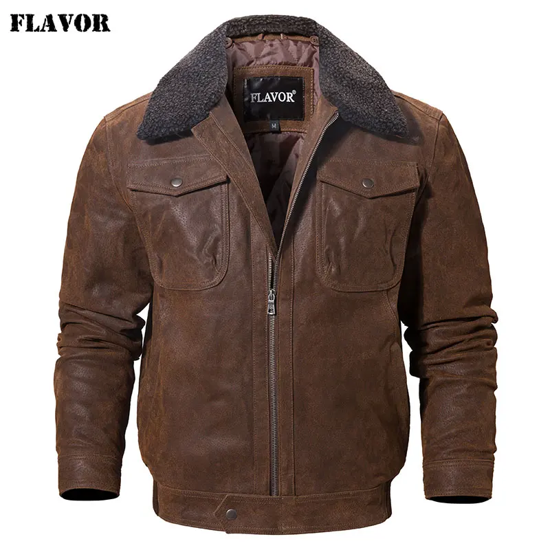 New FLAVOR Men's Real Leather Jacket Genuine Leather jacket with faux fur collar male Motorcycle warm c
